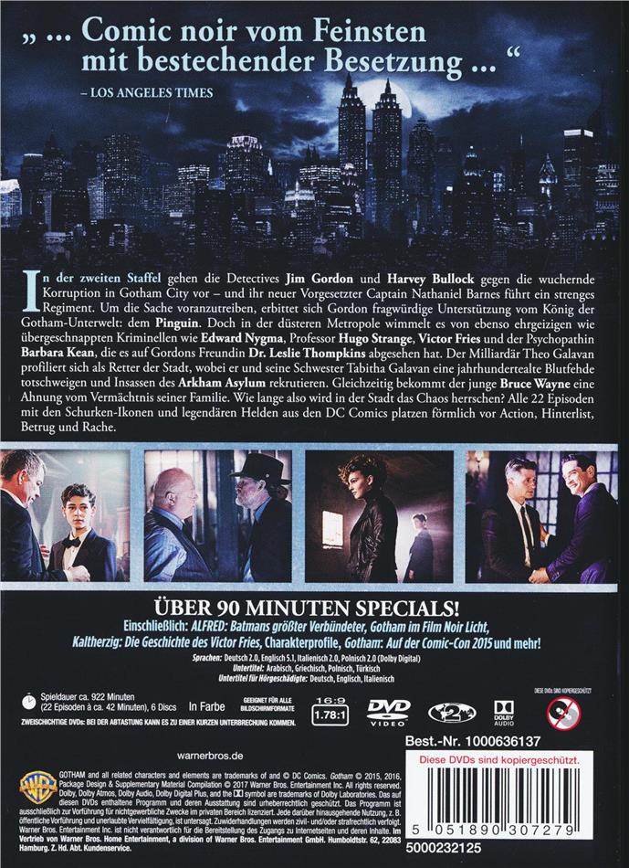 The origin story continues on Gotham and the stakes are higher than ever, as Super Villains more ambitious and depraved are introduced, and a shift of alliances shakes up the fight for power in Gotham City. In season two, Detective Jim Gordon and the ethically questionable veteran Detective Harvey Bullock remain at the forefront of the fight against crime in this dangerously corrupt city. While confronting Gotham's most notorious criminals, however, Gordon's moral compass begins to waver, but he is taken under the wing of Nathaniel Barnes, a law-and-order zealot who is unafraid of making enemies. At the same time, Gordon continues his quest to gain the trust of the young Bruce Wayne, who is on a clear path towards the man he is destined to become, after discovering his father's deepest secrets, with the help of his trusted butler and mentor, Alfred Pennyworth, and newfound ally at Wayne Enterprises, Lucius Fox.