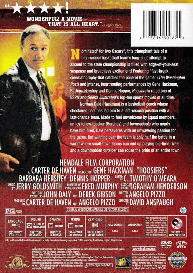 Nominated for two Academy Awards, this triumphant tale of a high school basketball teams` long-shot attempt to ascend to the State Championship is filled with edge-of-your-seat suspense and breathless excitement! Featuring "fast-break cinematography that catches the pace of the game" (Washington Post) and intense, heart-rending performances from Gene Hackman, Barbara Hershey and Dennis Hopper, Hoosiers redefined the sports movie with a realism and frankness that make you believe in its small-town characters - and cheer for them over and over again.