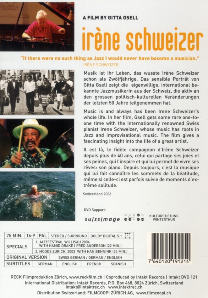 Music is and always has been Irene Schweizer's whole life. In her film, Gsell gets some rare one-to-one time with the internationally renowned Swiss pianist Irene Schweizer, whose music has roots in Jazz and improvisational music. The film gives a fascinating insight into the life of a great artist.