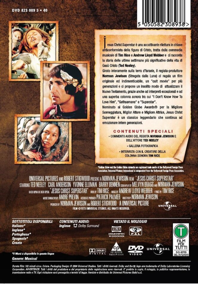 Der Klassiker mit Ted Neely, Carl Anderson und Yvonne Ellingman. Carl Anderson überzeugt mit seiner hammermässigen Interpretation des Judas, Ted Neely gab eine neue Interpretation der Role des Judas zum Besten. Der 70-er Jahre charme des Filmes mag nicht jedem gefallen, trügt aber nicht über die gute Qualität der Verfilmung hinweg.