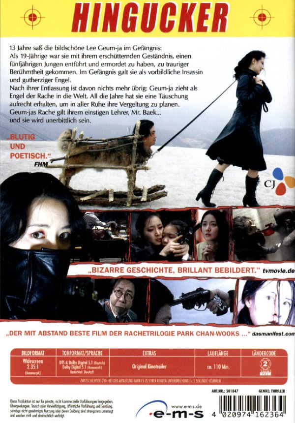 Dritter Teil der "Rache"-Trilogie. Kommt nicht ganz an "Sympahty for Mr. Vengeance" und "Oldboy" heran. (Beide sehr gut!)Teilweise ein bisschen konfus (Mutter / Tocher -Beziehung) und mit zuvielen unnötigen Nebensächlichkeiten. (z.B. Gefängnisszenen). Eine Szene kurz vor Schluss ist ziemlich heavy. (Aufzeichnung der Kindermorde).