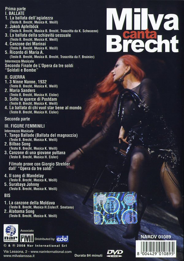 Alles, was an Musikpreisen in ihrer Heimat zu gewinnen war, konnte Milva für sich verbuchen. Über die Grenzen Italiens hinaus ist Milva international auf der ganzen Welt erfolgreich. Ihre speziellen Musikprogramme, mit denen sie auf Tour ist, erhielten grösstes Kritikerlob und wurden mit internationalen Preisen überhäuft. Jetzt endlich erscheint "Milva canta Brecht" auf DVD aufgenommen in dem weltberühmten "Piccolo Teatro" in Mailand.