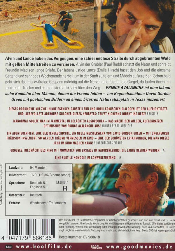 An odd couple of sorts, introspective and stern Alvin (Rudd) and his girlfriend`s brother, Lance (Hirsch), dopey and insecure, leave the city behind to spend the summer of 1988 repainting the traffic lines on a desolate country highway where the surrounding areas have been ravaged by wildfire. In this solitary backdrop, the two bicker and joke with each other as they reflect on their relationships with women, resulting in a clumsy fall headfirst into an unlikely friendship.