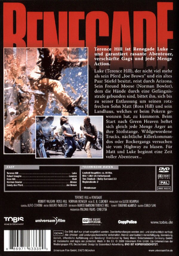 Ich finde sehr schade,dass es nicht möglich ist den Film Renegade mit T.Hill in deutscher version endlich auf DVD anzubieten,denn die nachfrage ist sicher sehr gross.Schade