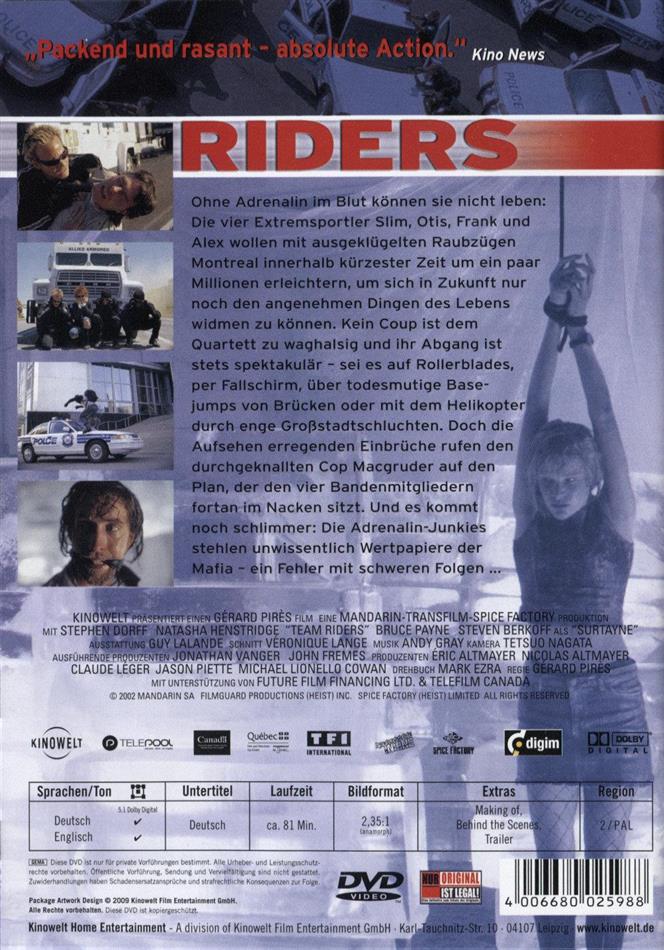 Ist doch mal was anderes, die Hauptdarsteller mit Rollerskates durch die Strassen von Montréal fahren zu lassen! "Riders" besticht nicht nur durch die Besetzung (Natasha "Species" Henstridge ist Kanadierin!), sondern auch durch coole Action, gute Sprüche und geniale Ideen (Geldtransporter im Sankt Lorenz-Strom versenken, Jumping von der Brücke, Polizeiauto im Bus...). Schade, lief dieser Streifen nicht länger in den Kinos! Die Handschrift des französischen Regisseurs Gérard Pires unverkennbar (hat der nicht "Taxi Taxi" gemacht?).