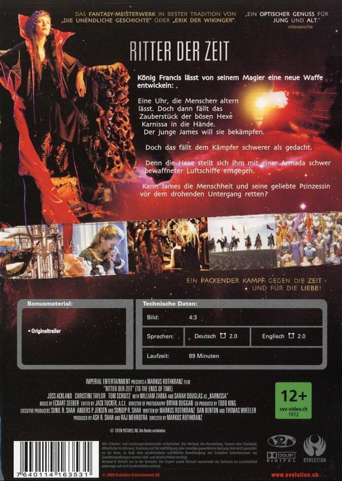 In a mythical kingdom among the clouds, one young stable boy named James (Tom Schultz) dreams of becoming a hero and to catch the eye of little Princess Stephanie (Christine Taylor, Zoolander). But when the kingdom falls under attack from air pirates, King Francis (Joss Ackland, Lethal Weapon 2) orders his most trusted advisor, the magician Aeschylus, to create a device to end all wars... a magical clock with the power to control time itself, to make years be reduced to seconds and a lifetime to pass in an instant. Refusing to wield such huge power, the King orders Aeschylus to destroy the clock and its plans. That night, however, the magician is killed by orders of evil sorceress Karnissa (Sarah Douglas, Superman II), who steals the clock and unleashes a curse upon the kingdom. As everyone grows old, James must embark on a race against time to safe his land, his love and the world from destruction.