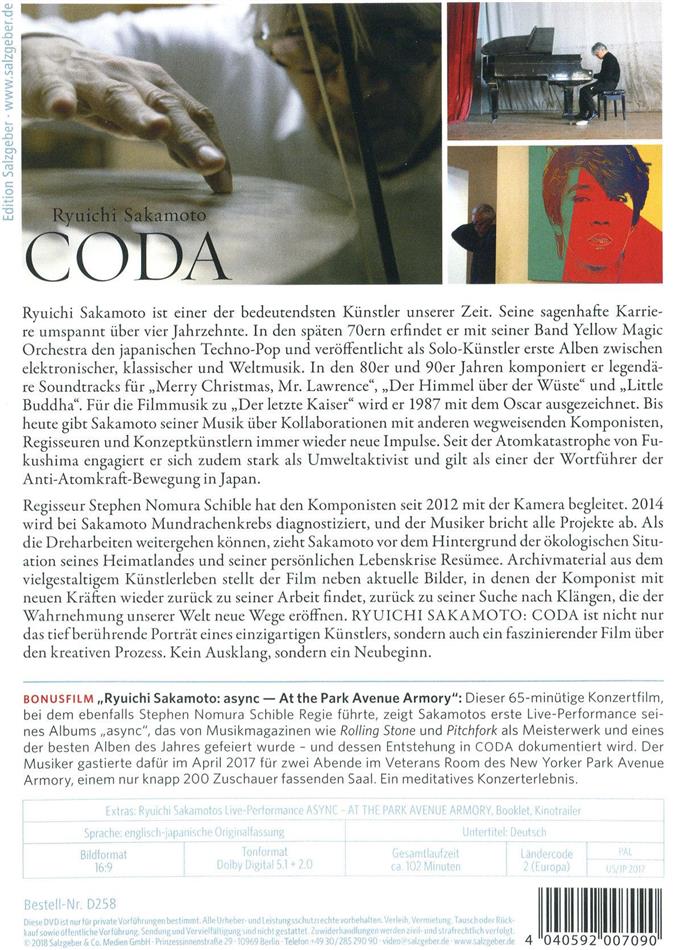 Regisseur Stephen Nomura Schible hat den Komponisten seit 2012 mit der Kamera begleitet. 2014 wird bei Sakamoto Mundrachenkrebs diagnostiziert, und der Musiker bricht alle Projekte ab. Als die Dreharbeiten weitergehen können, zieht Sakamoto vor dem Hintergrund der ökologischen Situation seines Heimatlandes und seiner persönlichen Lebenskrise Resümee. Archivmaterial aus dem vielgestaltigem Künstlerleben stellt der Film neben aktuelle Bilder, in denen der Komponist mit neuen Kräften wieder zurück zu seiner Arbeit findet, zurück zu seiner Suche nach Klängen, die der Wahrnehmung unserer Welt neue Wege eröffnen, zurück zu einem neuen musikalischen Ausdruck. RYUICHI SAKAMOTO: CODA ist nicht nur das tief berührende Porträt eines einzigartigen Künstlers, sondern auch ein faszinierender Film über den kreativen Prozess. Kein Ausklang, sondern ein Neubeginn.