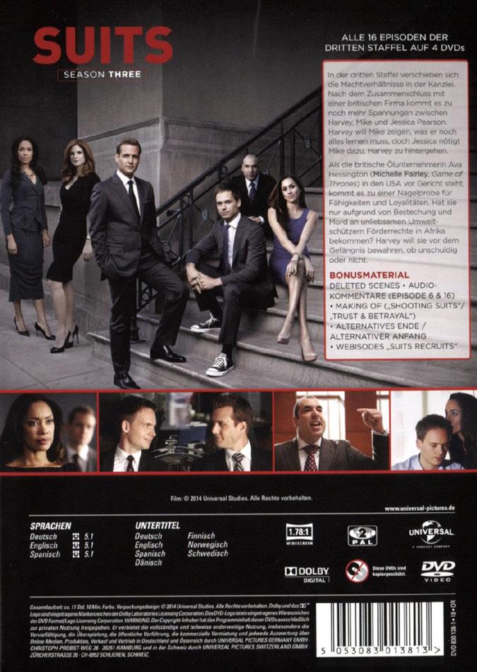 In der dritten Staffel verschieben sich die Machtverhältnisse in der Kanzlei. Nach dem Zusammenschluss mit einer britischen Firma, kommt es zu noch mehr Spannungen zwischen Harvey, Mike und Jessica Pearson. Harvey will Mike zeigen, was er noch alles lernen muss, doch Jessica nötigt Mike dazu, Harvey zu hintergehen. Als die britische Ölunternehmerin Ava Hessington in den USA vor Gericht steht, kommt es zu einer Nagelprobe für Fähigkeiten und Loyalitäten. Hat sie nur aufgrund von Bestechung und Mord an unliebsamen Umweltschützern Förderrechte in Afrika bekommen? Harvey will sie vor dem Gefängnis bewahren, ob unschuldig oder nicht.