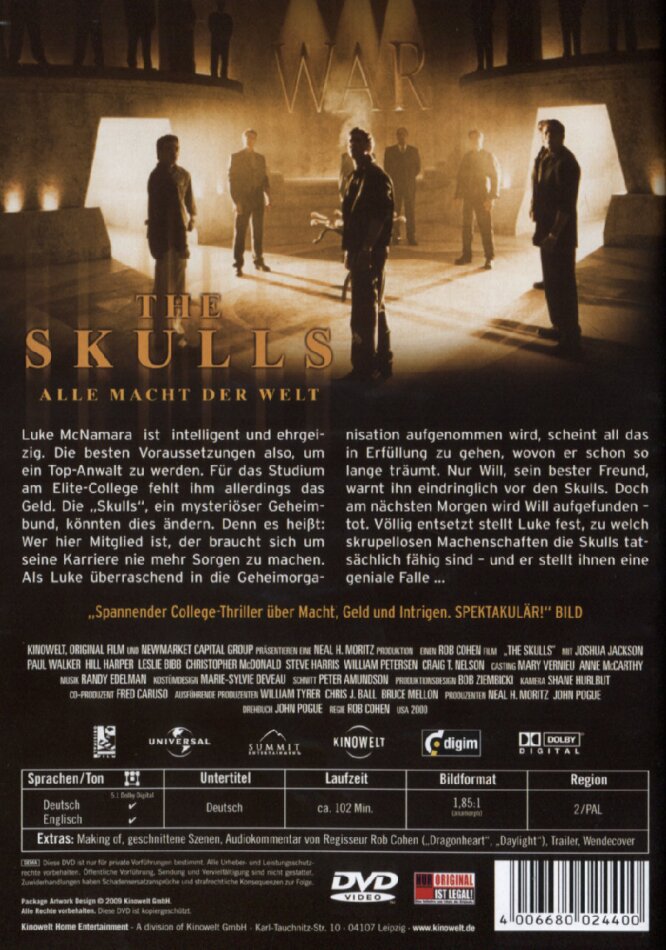 cohen hat immer gute ideen, nur verfilmt er sie immerzu miserabel! the skulls sind nicht anders als andere die die zusammen eine starke gruppe bilden, die dank irgendwelcher herren mit dicken portemonnaies ein gut bezahltes leben führen!! -