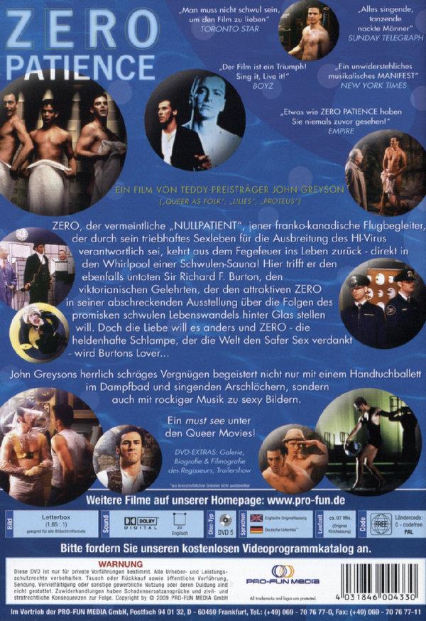 ZERO, der vermeintliche "NULLPATIENT", jener franko-kanadische Flugbegleiter, der durch sein triebhaftes Sexleben für die Ausbreitung des HIVirus verantwortlich sei, kehrt aus dem Fegefeuer ins Leben zurück - direkt in den Whirlpool einer Schwulen-Sauna! Hier trifft er den ebenfalls untoten Sir Richard F. Burton, den viktorianischen Gelehrten, der den attraktiven ZERO in seiner abschreckenden Ausstellung über die Folgen des promisken schwulen Lebenswandels hinter Glas stellen will. Doch die Liebe will es anders und ZERO - die heldenhafte Schlampe, der die Welt den Safer Sex verdankt - wird Burtons Lover... John Greysons herrlich schräges Vergnügen begeistert nicht nur mit einem Handtuchballett im Dampfbad und singenden Arschlöchern, sondern auch mit rockiger Musik zu sexy Bildern.