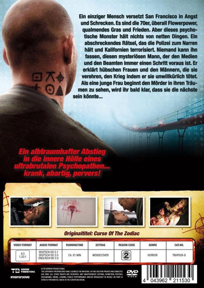 Der Filmemacher Ulli Lommel ist seit vierzig Jahren im Geschäft und ein Phänomen. Ehemaliger Fassbinder-Darsteller, haben es seine Semi-Klassiker ?Die Zärtlichkeit der Wölfe (1973)? und ?Der Boogeyman (1979)? zu einiger Berühmtheit in Genre-Kreisen gebracht. Der in die USA ausgewanderte Regisseur verblüfft immer wieder durch unterirdischste Video-Produktionen oder, noch schlimmer, mit einem Deutschland-Comeback im Jahre 2004 mit einem Film über Daniel Küblböck(!). Sein Zodiac-Film lehnt sich nur irgendwie an die reale Figur an, spielt irgendwie im heutigen San Francisco und postuliert, dass der Zodiac-Killer nach wie vor auch heute noch irgendwie sein Unwesen treibt. Dreimal ?irgendwie? in einem Satz; dies liegt daran, dass ?Curse of the Zodiac? ein seltenes Chaos von einem Film darstellt, dem man kaum folgen kann. Offensichtlich um Bestleistungen in den Disziplinen verwackelte Kamera und wirre Montage bemüht, entstanden im wahrsten Sinne des Wortes kaum fassbare Video-Bilder, die sich auch nicht nur entfernt zu einem Film zusammenfügen, zusammengehalten von einem Sprecher mit Tourette-Syndrom auf Crack, der unfassbar wirres Zeugs von sich gibt, was fast schon wieder unterhält, wenn man selbst entsprechende Substanzen zu sich nehmen würde. Kunst kommt auch von Kunstfertigkeit, leider kann man diesen Film nicht als surreales Happening durchgehen lassen, weil man in keiner Sekunde davon überzeugt ist, in den Händen eines kompetenten Filmemachers sich zu befinden. Selbst für einen Anfänger wäre dieser Film peinlich und die Vorwegnahme eines abrupten Karriere-Endes. Bei einem jahrzehntelangen Veteranen wie Ulli Lommel ist das Ergebnis schlicht tragisch und fast nicht beschreibbar, wenn man nicht in Mastdarm-Kategorien verfallen möchte.