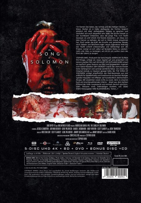 "Im Namen des Vaters, des Sohnes und des Heiligen Geistes...!" Marys Mutter ist in heller Aufregung: die Tochter beginnt plötzlich mit einer verfremdeten Stimme zu sprechen und verändert sich auch körperlich sehr stark. Die Kirche kommt zu der furchtbaren Erkenntnis, dass die junge Frau vom Teufel besessen ist und schickt ihre besten Exorzisten, um Mary von dem Dämon zu befreien, der sich in ihrem Körper eingenistet hat. Doch weder die Kraft des Kruzifix und geweihtes Wasser, noch Gebete und Beschwörungen zeigen irgendeine Wirkung. Der Teufel scheint unbezwingbar und bemächtigt sich der Priester, zwingt sie sich selbst auf brutalste Weise zu verstümmeln oder Mary zu besteigen, um mit ihr als Luzifers Hure das Kind des Satans zu zeugen. STEPHEN BIRO, Produzent der berüchtigten AMERICAN GUINEA PIC-Trilogie, schlägt ein neues Kapitel auf und präsentiert mit seinem zweiten Film nach BOUQUET OF GUTS AND GORE erneut ein teuflisch gutes Szenario aus Blut und Eingeweiden. Inspiriert vom Genre-Klassiker DER EXORZIST macht der Horrorschocker keine Gefangenen und sprengt sämtliche Tabus, von denen das Original niemals zu träumen gewagt hätte. Bei THE SONG OF SOLOMON schlägt unaufhörlich das Ekel-Barometer aus und entfacht für Splatterfreaks und Gorehounds ein brachial-blutiges Splatter-Massaker mit Effekten auf handwerklich allerhöchstem Niveau. Wir empfehlen vorab nichts zu essen, denn es erwartet Euch ein knochensplitterndes Inferno - direkt aus dem tiefsten Schlund der Hölle ausgespuckt und erstmals deutsch synchronisiert.