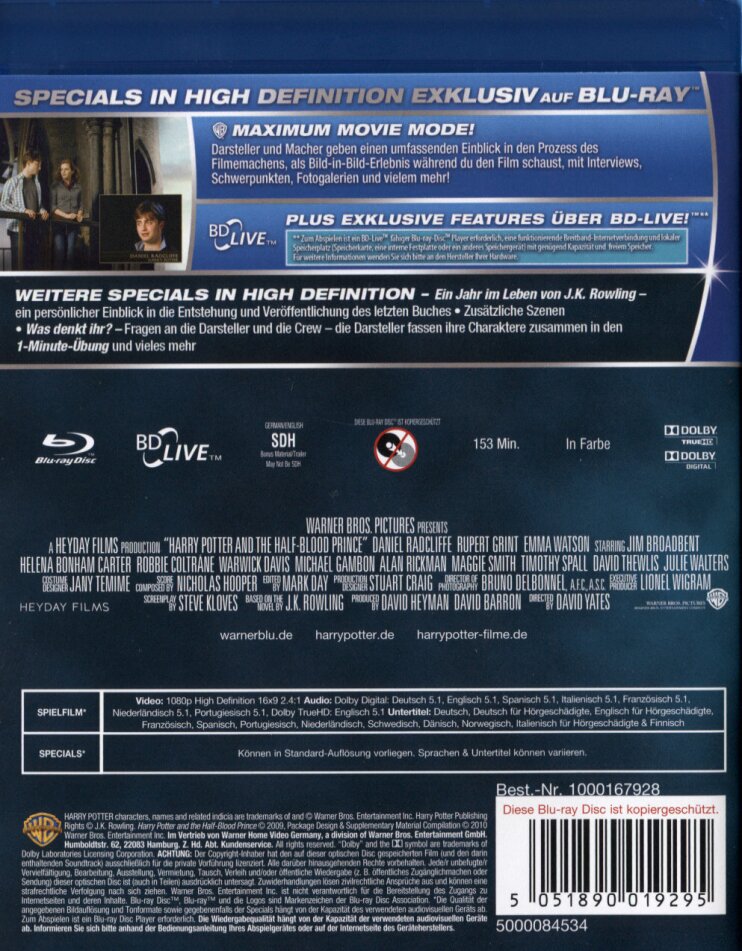 Für mich bis jetzt die beste Harry-Potter-Verfilmung. Hier stimmt alles und die Stimmung ist schön düster. Nur das mit dem Halbblutprinz ist im Film eher Nebensache und wird von solchen die das Buch gelesen haben wohl nicht ganz verstanden. Ansonsten 1A!