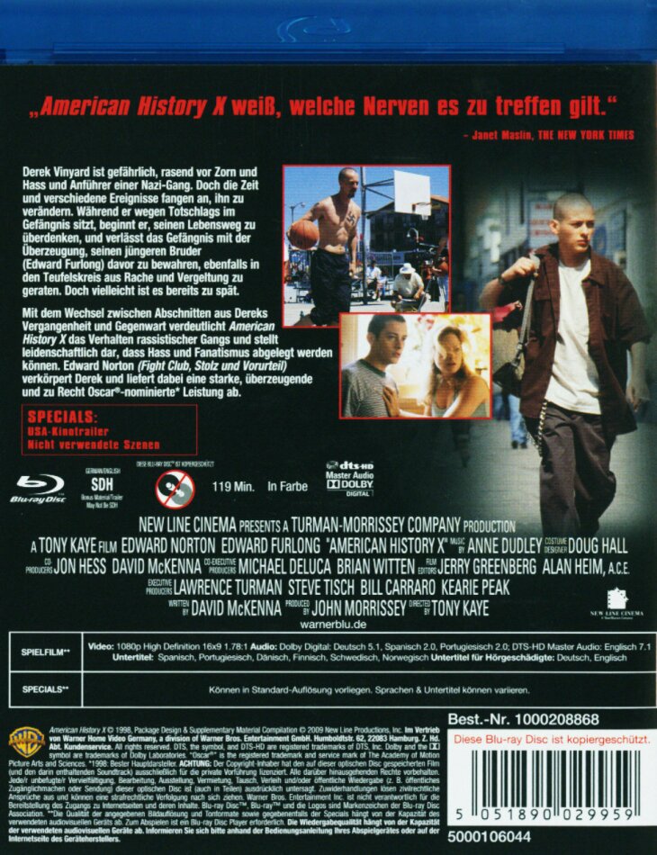 vorerst einmal: nichts gegen american history x! echt, der film ist gut gemacht- technisch gesehen! allerdings berührt er einen einfach ÜBERHAUPT NICHT!!!! die ganze schwarz-weiss-geschichte wirkt inszeniert und die botschaft kommt nicht im geringsten an! dass ausgerechnet amis einen solchen film produzieren- darüber kann man ja nur lachen! das einzig sinnvolle an diesem film ist die beziehung zwischen derek und danny; in der rolle des grossen bruders kann man sich immerhin noch mit derek identifizieren...