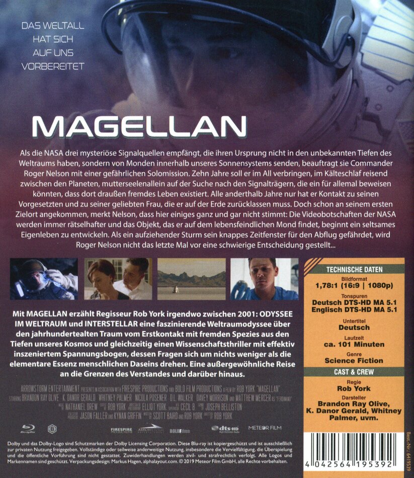 Als die NASA drei mysteriöse Signalquellen empfängt, die ihren Ursprung nicht in den unbekannten Tiefen des Weltraums haben, sondern von Monden innerhalb unseres Sonnensystems senden, beauftragt sie Commander Roger Nelson mit einer gefährlichen Solomission. Zehn Jahre soll er im All verbringen, im Kälteschlaf reisend zwischen den Planeten, mutterseelenallein auf der Suche nach den Signalträgern, die ein für allemal beweisen könnten, dass dort draussen fremdes Leben existiert. Alle anderthalb Jahre nur hat er Kontakt zu seinen Vorgesetzten und zu seiner geliebten Frau, die er auf der Erde zurücklassen muss. Doch schon an seinem ersten Zielort angekommen, merkt Nelson, dass hier einiges ganz und gar nicht stimmt: Die Videobotschaften der NASA werden immer rätselhafter und das Objekt, das er auf dem lebensfeindlichen Mond findet, beginnt ein seltsames Eigenleben zu entwickeln. Als ein aufziehender Sturm sein knappes Zeitfenster für den Abflug gefährdet, wird Roger Nelson nicht das letzte Mal vor eine schwierige Entscheidung gestellt... Mit MAGELLAN erzählt Regisseur Rob York irgendwo zwischen 2001: ODYSSEE IM WELTRAUM und INTERSTELLAR eine faszinierende Weltraumodyssee über den jahrhundertealten Traum vom Erstkontakt mit fremden Spezies aus den Tiefen unseres Kosmos und gleichzeitig einen Wissenschaftsthriller mit effektiv inszeniertem Spannungsbogen, dessen Fragen sich um nichts weniger als die elementare Essenz menschlichen Daseins drehen. Eine aussergewöhnliche Reise an die Grenzen des Verstandes und darüber hinaus.