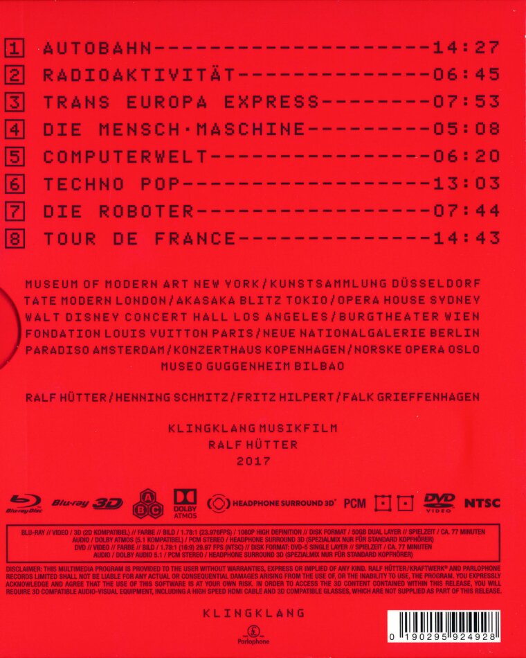Dokumentation der spektakulären Multi-Media 3-D-Auftritte der Elektronik-Pioniere Kraftwerk in den führenden Kunstmuseen der Welt (Museum of Modern Art New York, Tate Modern London, Neue National Galerie Berlin und vielen anderen) aus den Jahren 2012 bis 2016 in höchster Bild- und Tonqualität.