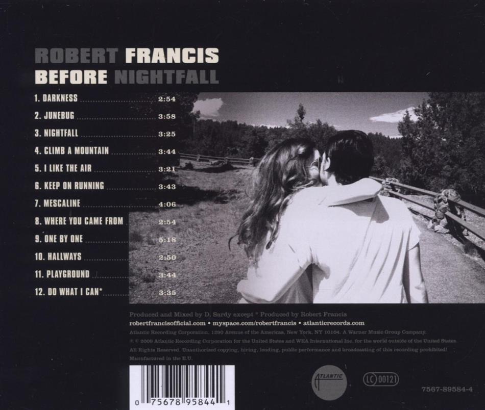 Auf "Before Nightfall" gibt Robert Francis Einblick in sein Innerstes. Der Multiinstrumentalist aus LA kombiniert in seinen Kompositionen eine Vielzahl musikalischer Einflüsse mit einem Höchstmaß an Emotion, das erinnert an Madrugada oder Matthew Ryan. Dank seiner heiseren Bariton-Stimme und den klaren Arrangements kommt Francis? Offenheit bei seiner stetig wachsenden Fangemeinde hervorragend an. Es ist die fast intime Atmosphäre, in der Francis die gesamte Bandbreite von Country und Folk über den Blues bis zum Roots-Rock miteinander verschmilzt. Hat er sein Indie-Debüt "One By One" 2007 noch selbst produziert, gewann Robert für das Follow-Up "Before Nightfall" den Grammy-Gewinner D. Sardy (Oasis, Red Hot Chili Peppers und Marilyn Manson). Mit seinem Debüt liefert Robert Francis ein außergewöhnliches Album ab, welches unter Insidern schon jetzt als der Geheimtipp des Jahres gehandelt wird. In den vergangenen Monaten durfte Robert Francis & Band so prominente Kollegen wie John Butler Trio, Joss Stone und Milow als Special Guest auf Tour begleiten.