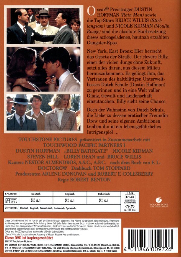 Handsomely mounted adaptation of E.L. Doctorow's award-winning novel chronicles teenager Billy Bathgate's (Loren Dean) obsession with hoodlums and his adventures with mobster Dutch Schultz (Dustin Hoffman) and his gang in 1930s New York City. Billy's association with the violent, unpredictable Schultz puts him in a series of potentially deadly situations. Nicole Kidman, Bruce Willis, Steve Buscemi star in this classy crime saga.