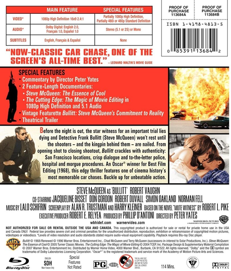 "Bullitt" ist ein Klassiker. Legende Steve McQueen die Ausgeburt der Coolness. Der Ford Mustang GT 390 der eigentliche Star des Films, da tritt die sonst eigentlich flache Story nach 60 Minuten in den Hintergrund. Dazu eine sexy Jacqueline Bisset. Die Verfolgungsjagd quer durch San Francisco hat Kultstatus. Dann gibt es noch den fetzigen Soundtrack von Lalo Schiffrin, jede Menge Flowerpowerfeeling und ein tolles Making Of. Und das zu diesem Preis...!