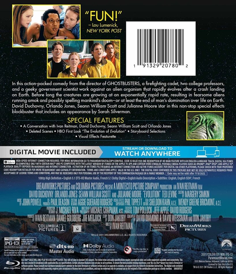 Director Ivan Reitman ("Ghostbusters") goes the sci-fi route with this wild comedy. David Duchovny is Dr. Ira Kane, PhD, a geology professor who teams with biology teacher Harry Phineas Block (Orlando Jones) to investigate a meteorite that crashed in the Arizona desert. They discover the rock is exuding a blue fluid that quickly evolves into icky alien organisms which threaten the future of the world. Julianne Moore, Seann William Scott, and Ted Levine also star. 101 min. Widescreen; Soundtracks: English DTS 5.1, Dolby Digital 5.1, Dolby Digital stereo, French Dolby Digital 5.1, Spanish Dolby Digital 5.1; Subtitles: English, French, Spanish; audio commentary; deleted scenes; featurettes.