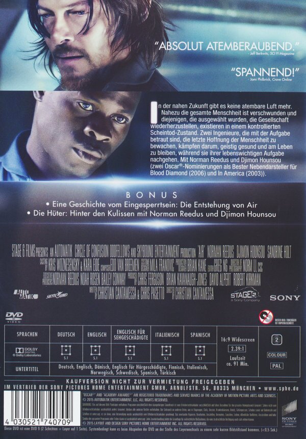 AIR nimmt diverse Chancen nicht wahr und verschenkt ungenutztes Potenzial. Für mich absolut unbegreiflich, wie der Autor von RED DEAD REDEMPTION ein derart unkreatives und ideenloses Drehbuch abliefert. Die beiden Hauptdarsteller Norman Reedus und Djimon Hounsou überzeugen, bleiben aber aufgrund des Drehbuchs unauffällig. Die düstere Endzeit-Thematik (kein Sauerstoff mehr auf der Erdoberfläche) ist ansprechend und erinnert an die Buchreihe DAS SILO von Hugh Howey, FALLOUT oder METRO 2033 von Dmitri Gluchowsky. Für hartgesottene Sci-Fi-Fans durchaus sehenswert, für alle anderen aber zu träge, zu langweilig und ohne spannende Twists.
