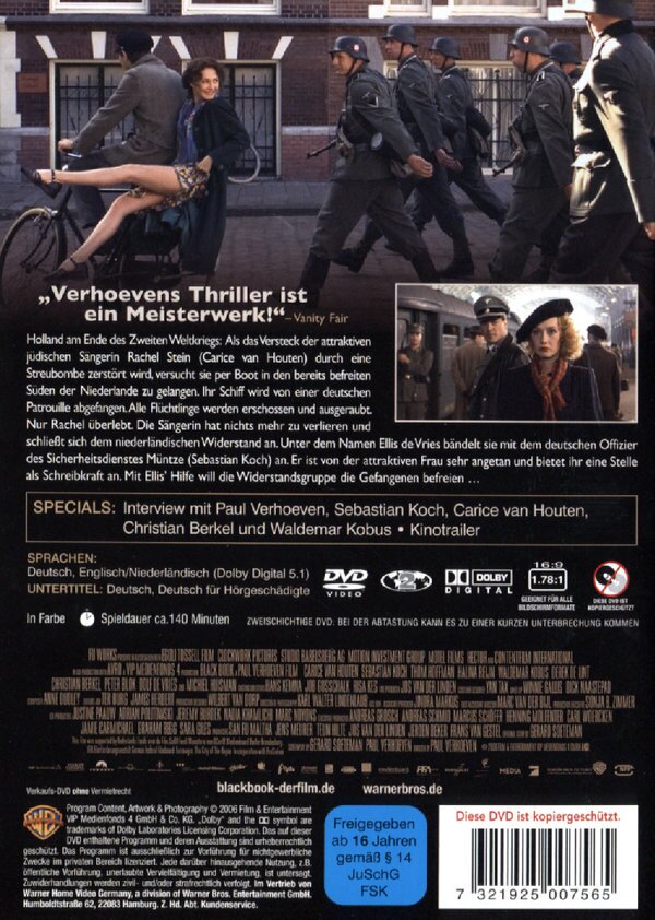 In the darkest days of World War II, Jewish fugitives attempt to escape occupied Holland - only to face a Nazi ambush. Rachel Stein (Carice van Houten) alone survives the attack and joins the Dutch Resistance to avenge her family. She soon confronts the ultimate test: she must infiltrate German headquarters by tempting Captain Ludwig Myntze (Sebastian Koch). In the heat of passion, he uncovers her duplicity...but keeps her secret. Then Rachel`s espionage reveals that a murderous traitor lurks within Resistance ranks. Unable to fully trust anyone, Rachel navigates a minefield of deception and becomes an enemy to both sides. Epic, passionate, breathtaking, Black Book relates an untold story of World War II where the distinctions between good and evil become blurred by the complexities of human nature.