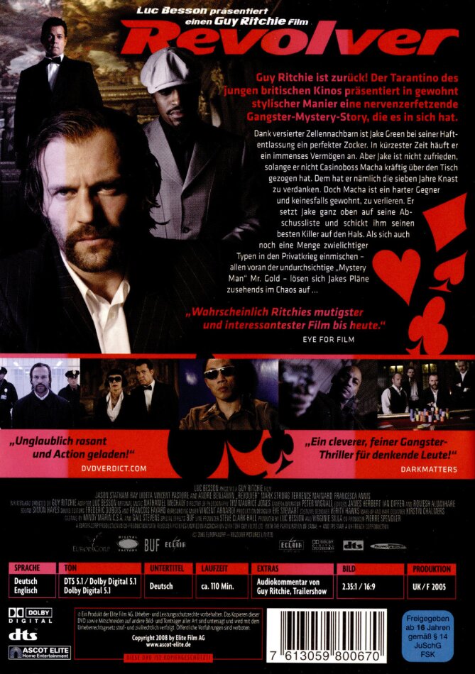 Super Film...jedoch, wie schon gesagt, muss man ihn zwei Mal anschauen um wircklich alles zu checken. Wer sagt Snatch und Lock Stock wären besser...da stimme ich nicht ganz zu. Revolver ist einfach anders und nicht mit den zwei anderen Filme vergleichbar.