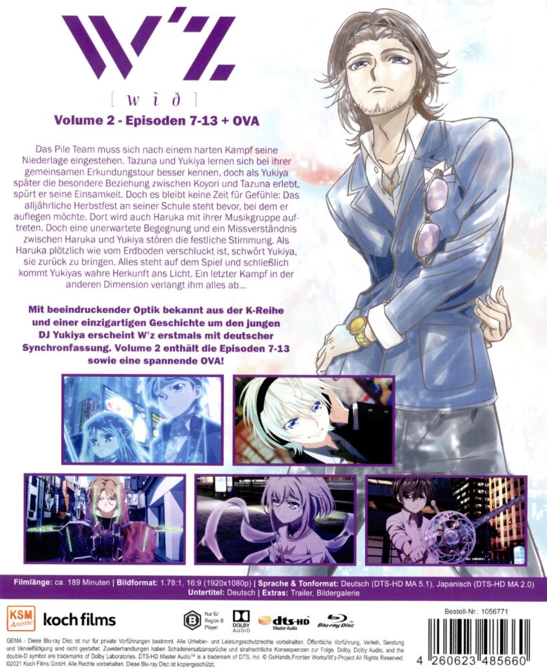 Mit beeindruckender Optik bekannt aus der K-Reihe und einer einzigartigen Geschichte um den jungen DJ Yukiya erscheint W’z erstmals mit deutscher Synchronfassung. Volume 2 enthält die Episoden 7-13 und eine spannende OVA!