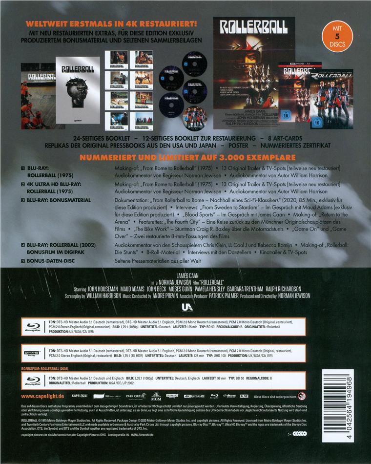 Die Sammlerbox enthält ausserdem John McTiernans Remake (2002) auf einer weiteren Bonus-Blu-ray im Digipak, ein doppelseitiges Poster, Artcards, ein nummeriertes Zertifikat, ein 24-seitiges Booklet sowie eine Bonus-Daten-Disc mit seltenen Pressematerialien aus aller Welt; UHD/Blu-ray: "From Sweden to Stardom" – Im Gespräch mit Maud Adams / "Blood Sports" – Im Gespräch mit James Caan / Making-of: "Return to the Arena" / Featurette: "The Fourth City" – Eine Reise zurück zu den Münchner Originalschauplätzen des Films / Featurette: "The Bike Work“ – Stuntman Craig R. Baxley über die Motorradstunts / Making-of: "From Rome to Rollerball" (1975) / 13 Original Trailer & TV-Spots [teilweise neu restauriert] / Audiokommentar von Regisseur Norman Jewison / Audiokommentar von Autor William Harrison; Bonus-Blu-ray: "From Rollerball to Rome – Nachhall eines Sci-Fi-Klassikers" / Zwei vintage 8mm-Reels: „Game On" und "Game Over"; Bonus-Blu-ray: John McTiernans ROLLERBALL (2002): Audiokommentar mit den Schauspielern Chris Klein, LL Cool J und Rebecca Romijn / Making-of Rollerball: Die Stunts / B-Roll Material / Interviews mit den Darstellern / Original Kinotrailer & Original TV-Spots
