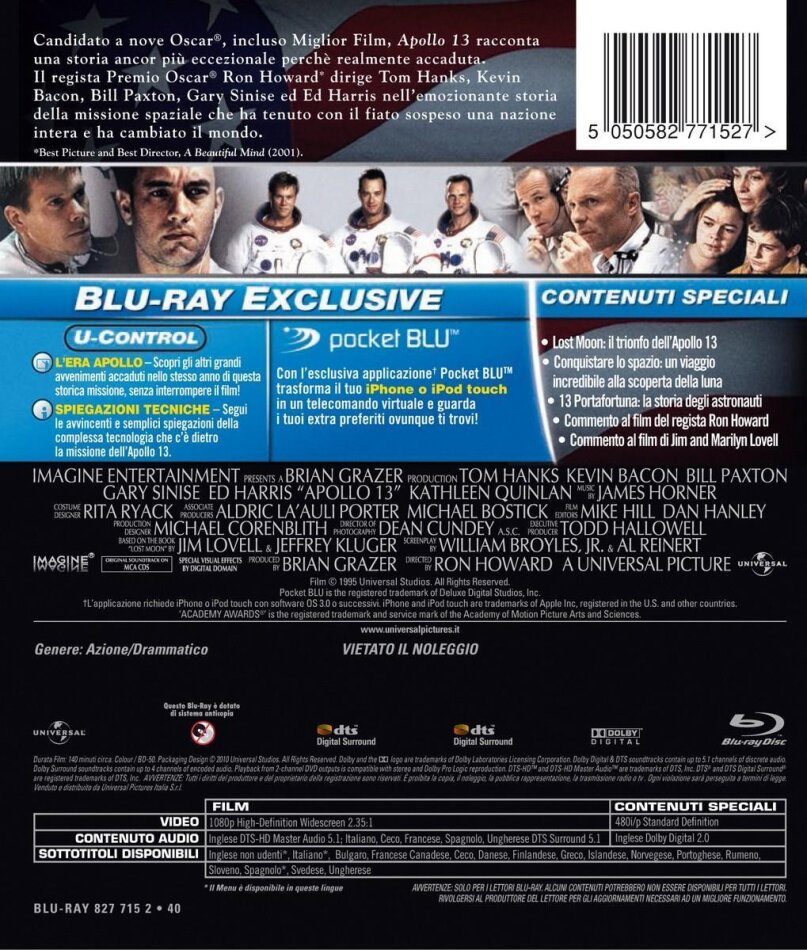 je me doute des films qui se passe dans l'espace mais celui la m'a étonné car il est vraiment excellent avec beaucoup de suspens. Ron Howard qui est un de mes realisateur préféré réunit une distribution extaordinaire avec un excellent Tom hanks comme d'habitude, Gary Sinise, Ed Harris et Kevin Bacon