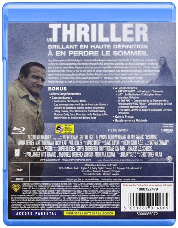 Will Dormer un as de la crim, part en compagnie de son coéquipier pour l`alaska, là où le soleil ne se couche jamais, afin d`aider les policiers locaux à résoudre le meurtre d`une jeune fille. Cela lui permet aussi de prendre le large au moment où la police des polices s`intéresse de près à ses méthodes dans certaines enquêtes. Epuisé dans le brouillard, il abat accidentellement son eoéquipier et prétend qu`il a été l`a vu et lui propose alors un marché...