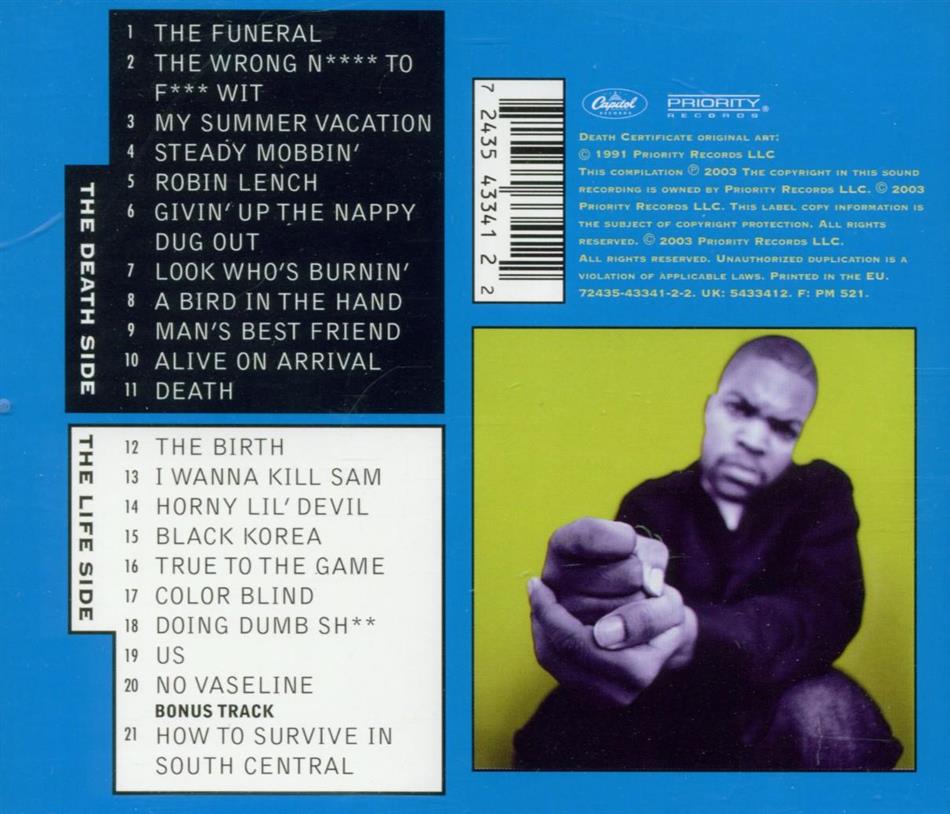 "Death Certificate" ist ein Konzeptalbum. Auf der "Death"-Side beschreibt Cube das Leben im Ghetto und die momentanen Zustände in den USA, während er auf der "Life"-Side zeigt, wie sich die Black Community seiner Meinung nach entwickeln müsste. Produktionen von Public Enemy's The Bomb Squad, gute Gastraps - "Death Certificate" hat alles, was ein erstklassiges Rapalbum ausmacht.