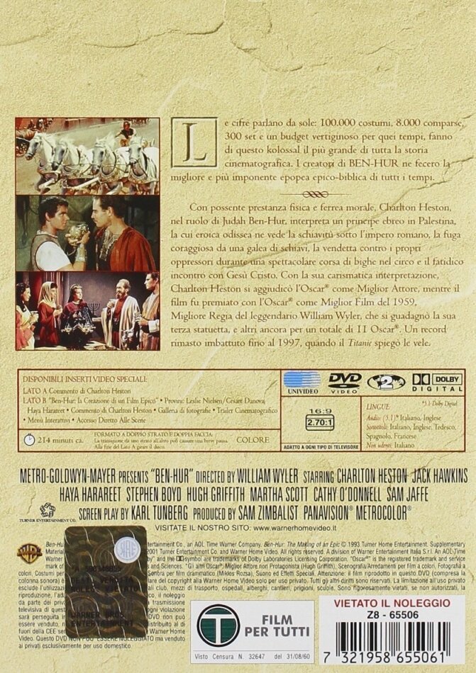 Le cifre parlano da sole: 100.000 costumi, 8.000 comparse, 300 set e un budget vertiginoso per quei tempi, fanno di questo kolossal il più grande di tutta la storia cinematografica. I creatori di BEN HUR ne fecero la migliore e più imponente epopea epico-biblica di tutti i tempi. Con possente prestanza fisica e ferrea morale, Charlton Heston, nel ruolo di Judah Ben Hur, interpreta un principe ebreo in Palestina, la cui eroica odissea ne vede la schiavitù sotto l`impero romano, la fuga coraggiosa da una galea di schiavi, la vendetta contro i propri oppressori durante una spettacolare corsa di bighe nel circo e il fatidico incontro con Gesù Cristo. Con la sua carismatica interpretazione, Charlton Heston si aggiudicò l`Oscar® come Miglior Attore, mentre il film fu premiato con l`Oscar® come Miglior Film del 1959, Migliore Regia del leggendario William Wyler, che si guadagnò la sua terza statuetta, e altri ancora per un totale di 11 Oscar®.