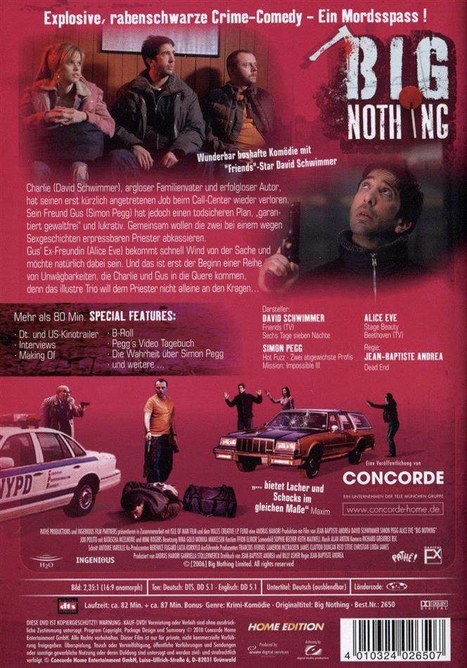 Charlie ist ein ehemaliger Lehrer, der vergeblich versucht, als Schriftsteller zu landen. Bei einem seiner wieder mal kurzen Gelegenheitsjobs lernt er Gus kennen, einen kleinen Ganoven, der ihm einen interessanten Vorschlag macht, um an Geld zu kommen: Erpressung! Opfer soll der örtliche Pfarrer sein, von dem Gus weiss, dass er heimlich auf Pornoseiten surft . Für den kriminell bisher unbeleckten Charlie gibt’s einen pikanten Haken an der Sache, denn seine Ehefrau ist der lokale weibliche Sheriff. Dennoch lässt er sich überreden: Gemeinsam mit einer weiteren Komplizin, einer gewissen Josie, fordern die Möchtegern-Erpresser vom Gottesmann 200.000 Dollar. Reverend Smalls steigt glatt darauf ein ... Pidax präsentiert diese smarte Krimikomödie erstmals auf Blu-ray. Die Kritiken dazu waren weltweit positiv, so lobte die BBC die grossartige darstellerische Leistung von David Schwimmer und Simon Pegg, Yahoo Movies meinte, der Film sei "schlau, raffiniert, pfiffig, elegant unterspielt" und das Lexikon des Internationalen Films schreibt, Big Nothing sei eine "amüsante schwarze Krimikomödie".