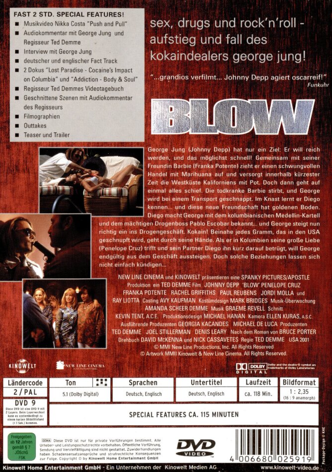 Blow ist ein Film an den man noch einen Tag später denken muss, weil er einem nicht loslässt. Denn bei anderen Filmen, die eine wahre Geschichte erzählen ist die Story am Anfang und am Ende etwas interesannt und dazwischen tote Hose, aber bei diesem Film nicht. Es ist sehr gut dargestellt, der Aufstieg und der sehr tiefe fall, und das Sprichwort “Wie der Vater so der Sohn” scheint hier seinen Uhrsprung her zu haben, und das meine ich nicht Beruflich bezogen. Jonny Depp überzeugt in seiner Rolle als georg jung, und was auch ein Lob verdient hat, ist das älter werden von Depp, dass wirklich echt aussah. Zum schluss noch, es ist zwar kein dramatisches Ende, aber ein aufwühlendes, so dass die sehr Sensiblen Personen unter euch vielicht zu trännen gerührt sein werden. also meine Empfelung unbedingt kaufen es lohnt sich.