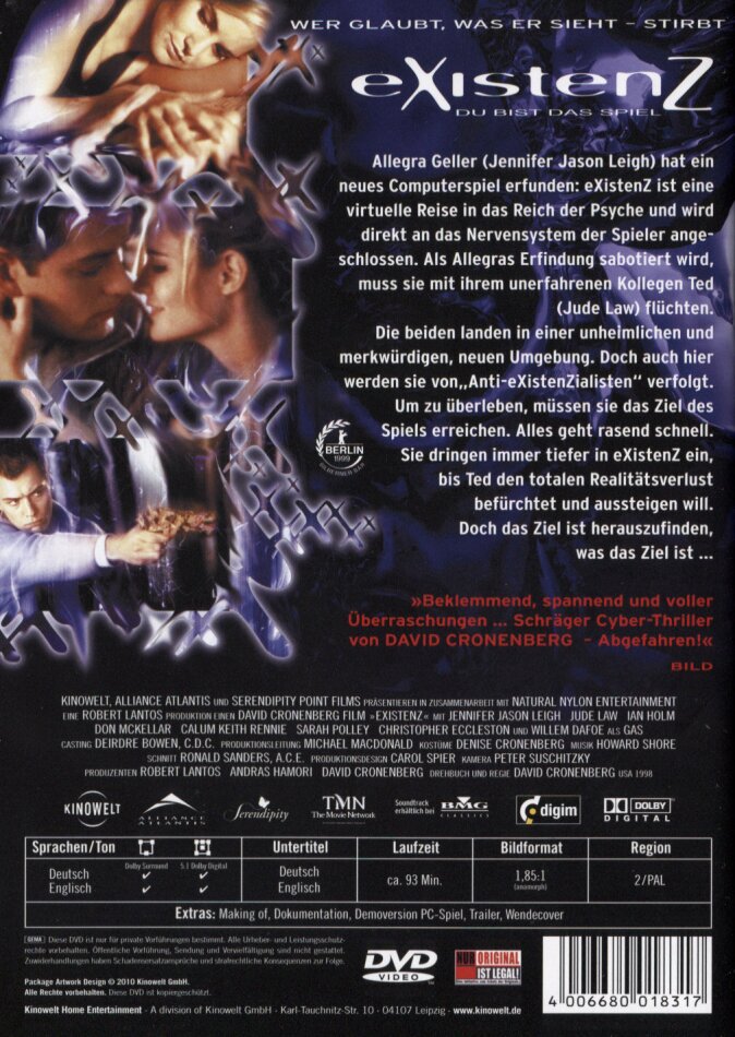 Im Kino wurde mir so öde, dass ich am liebsten gleich gegangen wäre. Ich liebe SciFi, aber ExistenZ ist reiner Müll. Pods waren die einzige neue Idee doch schnell wird klar, wo der Film endet. Am Ende reiht sich Firmenname an (Gegen-) Verschwörung. Nach der Pause sassen eindeutig weniger Leute im Kino.
