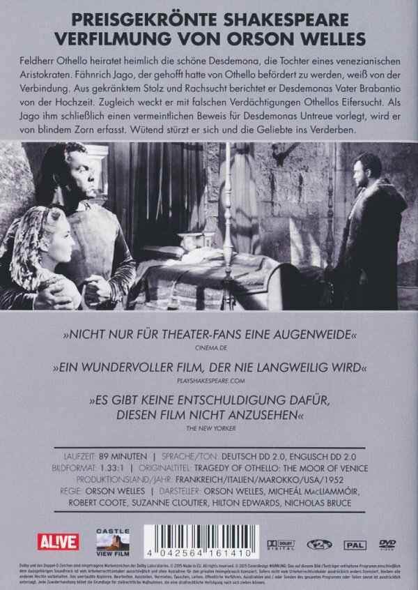 Der Feldherr Othello (Orson Welles) gewinnt die Liebe der jungen Desdemona (Suzanne Cloutier). Ihrem Vater Brabantio (Hilton Edwards), einem venezianischen Aristokraten, ist die Liaison ein Dorn im Auge. Aus Rachsucht dichtet Iago Desdemona zudem ein heimliches Verhältnis mit Cassio an, den Othello Iago als seinen Leutnant vorgezogen hat. Othello fängt daraufhin an, Iagos Einflüsterungen und seinen vermeintlichen Beweisen für Desdemonas Untreue Glauben zu schenken und fasst einen verhängnisvollen Entschluss...