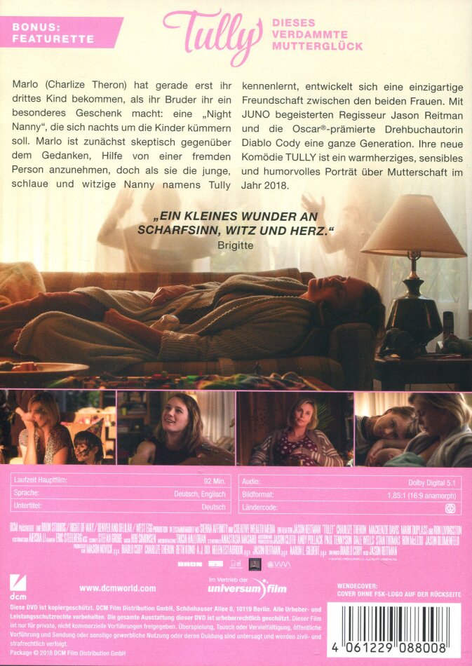 Neues Projekt vom "Young Adult"-Team: Charlize Theron spielt in der Komödie über Mutterschaft die Hauptrolle der Marlo, Mutter dreier Kinder, die eine „Night Nanny“ engagiert. Die Frau namens Tully kümmert sich von nun an nachts um die Kinder und ermöglicht Marlo ganz neue Freiheiten und Möglichkeiten. Eine ungewöhnliche Freundschaft entsteht… Jason Reitman führt Regie, Diablo Cody steuert das Drehbuch bei.