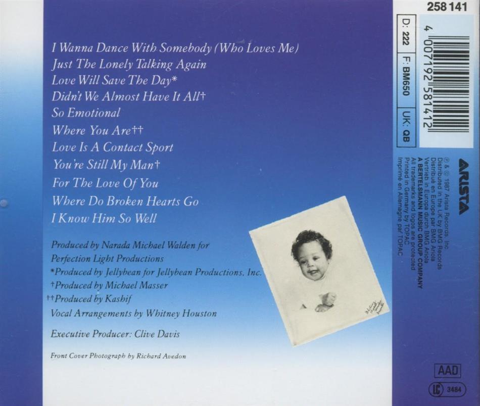 diese platte brachte whitney den durchbruch! ich kenne for the love of you, didn't we almost have it all, i wanna dance with somebody, just the lonely talking again und where do broken hearts go! ich liebe all diese songs! sie hat schon eine hammerstimme! auch wenn sie im moment mehr am kokain als an ihrer musik interessiert ist *wein* denn ihr neues album just whitney gefällt mir gar nicht!